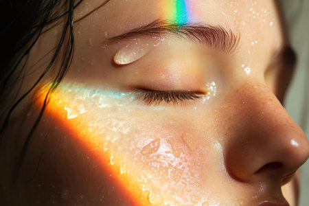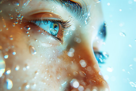 This close-up image highlights a radiant face, showcasing skin with raindrops that enhance its natural beauty. Captured in soft lighting, it reflects health and vitality.