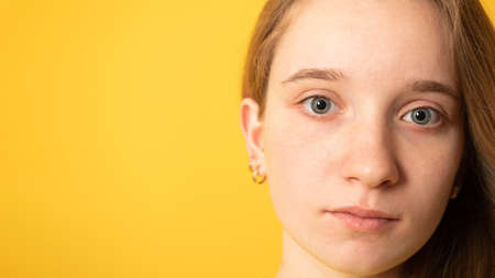 Close-up portrait of sad teenager girl with beautiful gray eyes. Pensive young woman with gray-blue eyes.