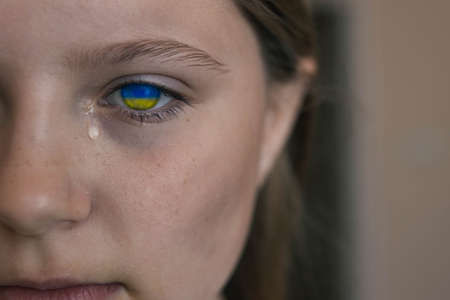 The pupil of the childs flag of Ukraine is blue yellow.Stop the war