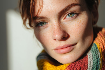 Closeup portrait of young woman in soft window light. Detailed skin texture freckles and green eyes. Calm thoughtful expression with natural beauty mood.