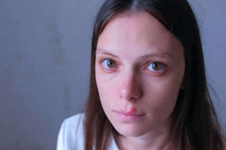 Portrait of sick woman with herpes virus sore on lip on mouth looking at camera on grey background. Process of dehydration during illness. Human papilloma virus, viral infection.
