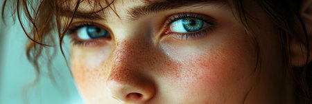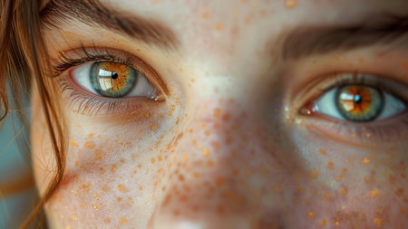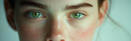 A young individual is portrayed with captivating green eyes and distinct freckles. The focus is on the vivid facial features, illuminated by soft, natural light, creating an engaging portrait.