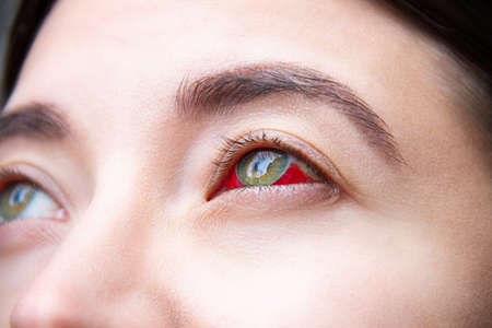 Closeup of female green eye stained with red blood. Сonsequences of surgery, intravitreal administration of medicinal product. Treatment of macular degeneration. Violence concept. Vision diseases.