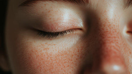 Close up of a womans face with closed eye, highlighting natural freckles, healthy skin, and long eyelashes, suggesting beauty and skincare concepts
