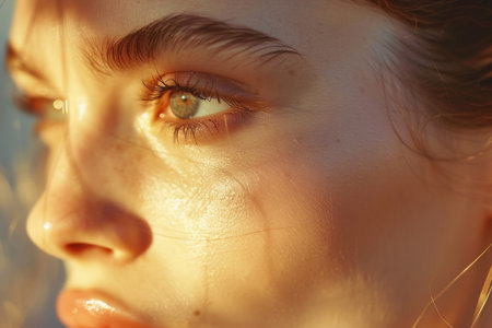 Close-up of clear skin and detailed eye under warm light, perfect for makeup and skincare design. Studio portrait for design and print.