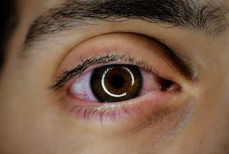 Close up of two annoyed red blood eyes of male affected by conjunctivitis or after flu, cold, allergy. Copy space for advertisement. Tired eyes after working at the computer. Close-up and macro