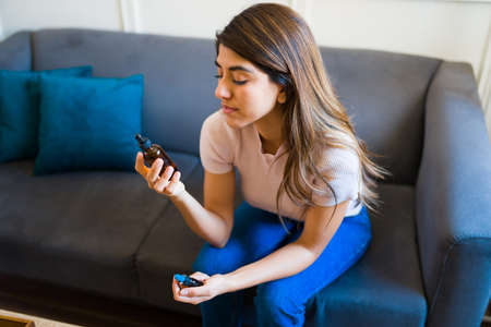 Gorgeous young woman reading the ingredients and instructions for use of the hemp CBD oil pipette of her medical treatment