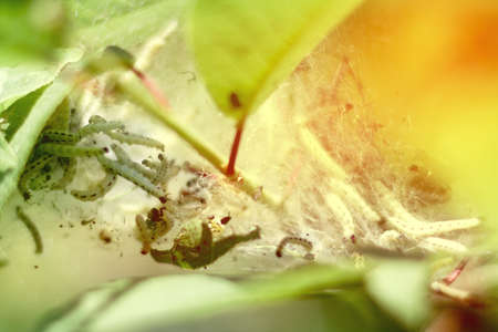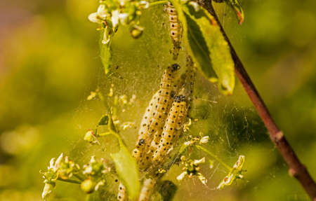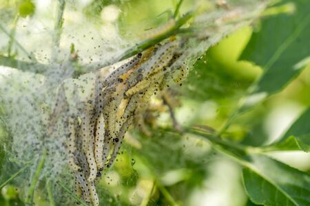 Closeup of a pest larvae caterpillars of the Yponomeutidae family or ermine moths, formed communal webs around a tree.