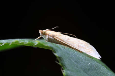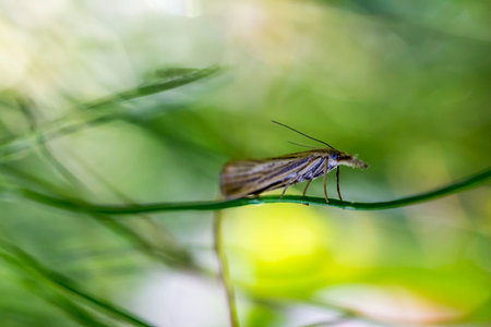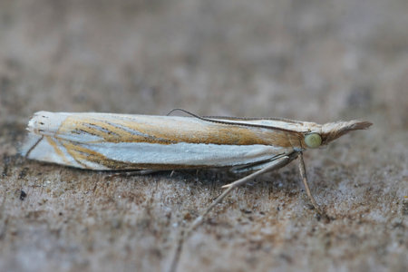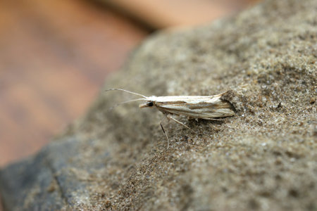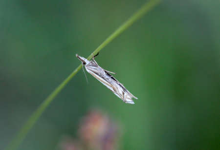 Closeup on a common grass veneer, Agriphila tristella sitting on piee of wood in the field
