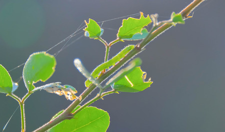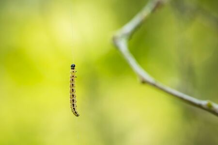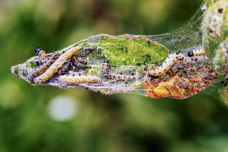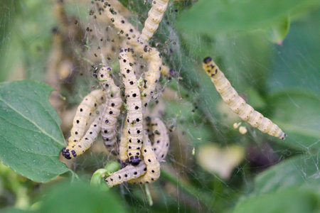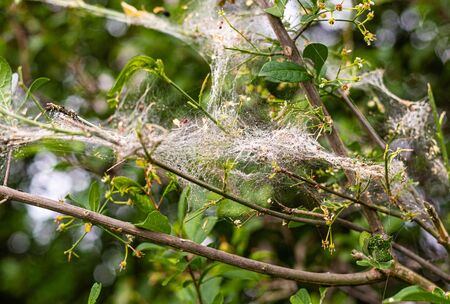detail of a plant covered with ermine moth web with caterpillars at spring time