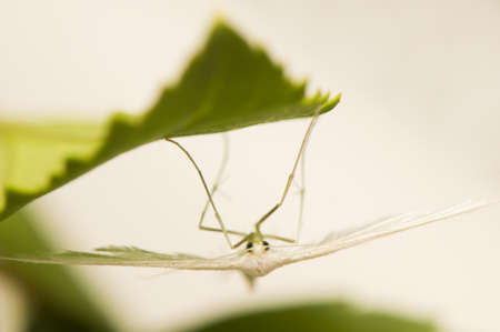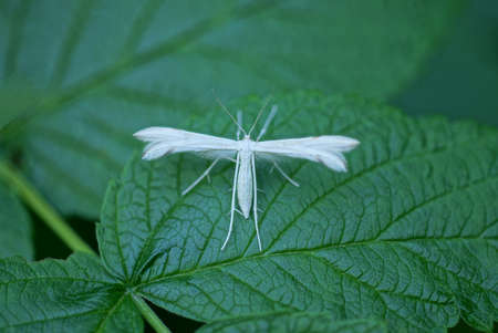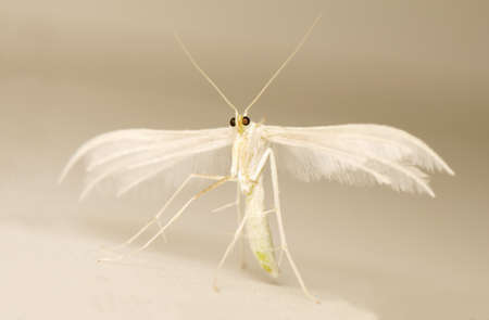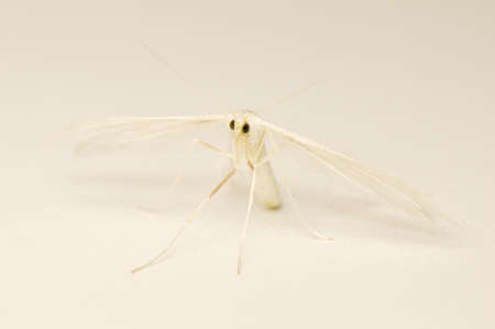Macrophotography of a White Plume Moth (Pterophorus pentadactyla) with natural background.