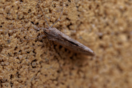Natural closeup on a small crambid moth, Closeup shot of the Catoptria falsella sitting on wood