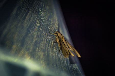 A closeup shot of the common micro moth Inlaid Grass-veneer on a piece of wood