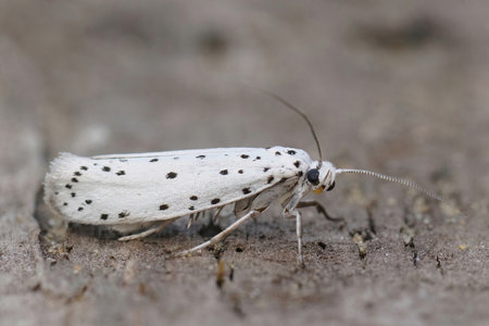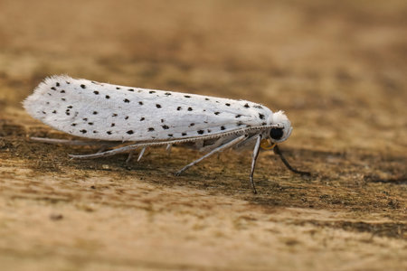 Detailed closeup on the white speckled Yponomeuta evonymella ,Bird-cherry Ermine, sitting on wood in the garden