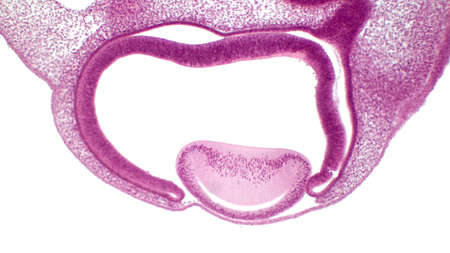 eye development. Cells from both the mesodermal and the ectodermal tissues contribute to the formation of the eye. In the center is a crystalline lens.