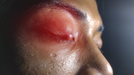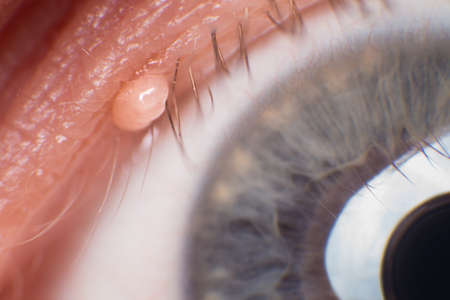 Close the abscess in the eye. hordeolum. stybarley in the eye. red eye, stye, light background