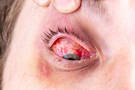 An eyelid is pulled out from a sick eye with inflamed veins from infection