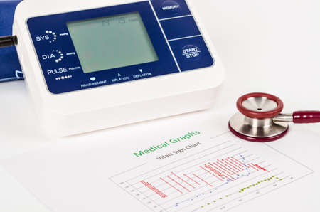 Vitals sign chart, Medical Graphs and Measuring blood pressure with red stethoscope on white background. Vital sign record concept.