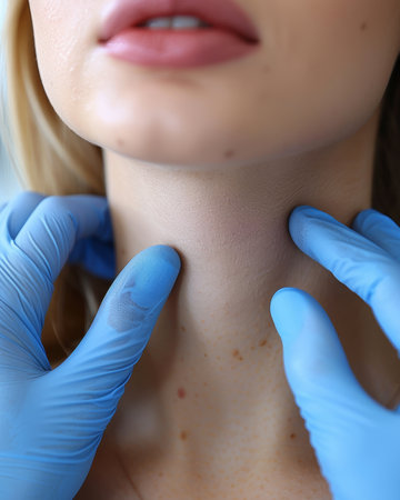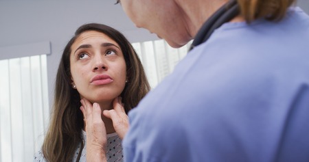 The doctor examines the thyroid gland of a girl. Hands in gloves feel the cartilaginous protrusion of the larynx