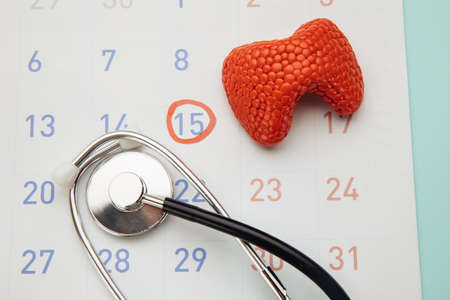 Thyroid gland near the stethoscope on calendar. Health care, diagnostics, medical testing, treatment and prevention of diseases concept
