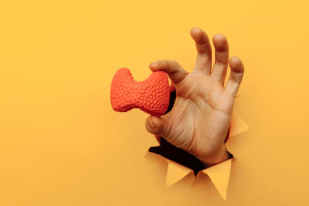 Male hand showing a thyroid out of a hole torn in yellow paper wall. Health care, pharmaceutics and medicine advertisement