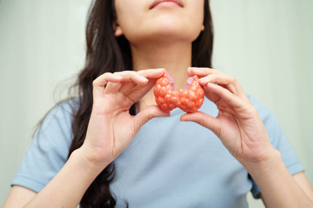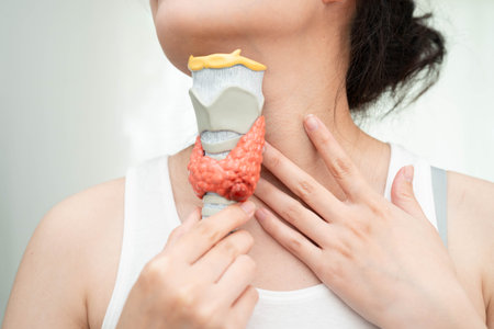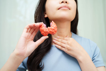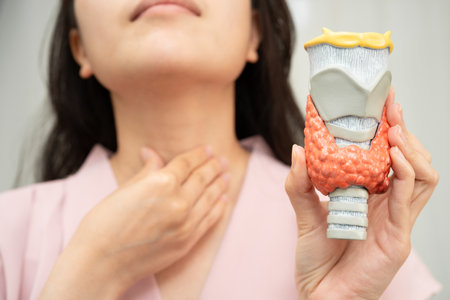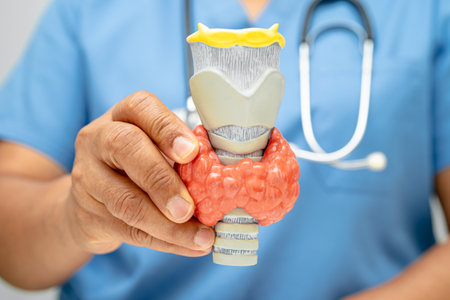 Hyperthyroidism, Overactive Thyroid, Thyroid Lymphoma, Asian woman with thyroid gland human anatomy model.