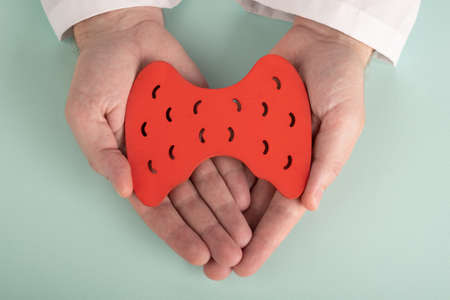 Holding thyroid organ in hands, drawing paper cut out, hyperthyroidism and hypothyroidism, health issues, cancer, hashimoto disease