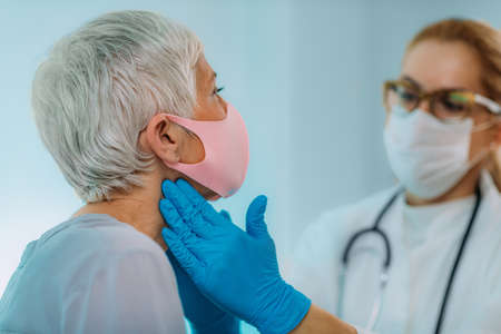 Doctor Examining Senior Woman with Thyroid Gland Problem.