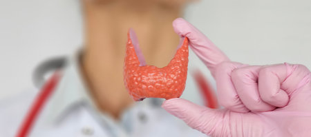 Hyperthyroidism, overactive thyroid, thyroid lymphoma. Doctor with thyroid anatomy model in hospital