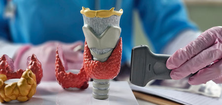 Models of thyroid anatomy on a wooden table with a person taking notes in a medical setting