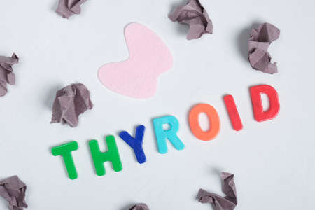 wads of paper, felt thyroid gland and the inscription thyroid gland on a gray background, treatment of thyroid diseases with the help of diet concept top view