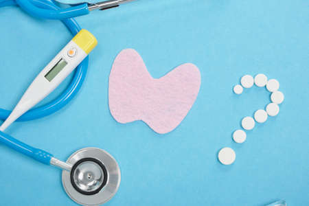 silhouette of the thyroid gland cut out of pink felt, a question mark from pills, a thermometer, ampoules and a stethoscope on a blue background, diagnostics and treatment of thyroid diseases concept