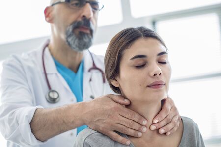 Close-up Of A Doctor's Hand Touching The Throat Of A Female Patient In The Clinic
