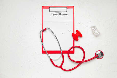 Clipboard with text THYROID DISEASE, pills and stethoscope on white background