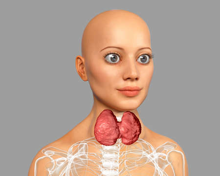 Hyperthyroidism. 3D illustration showing enlarged thyroid gland and exophthalmos (bulging eyes) in a female with Graves' disease, also known as toxic diffuse goiter