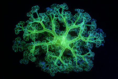 Neon green coral structure floats in deep ocean water. Surrounding highlights darkness bioluminescent shapes that softly diffuse light, creating a unique visual display.
