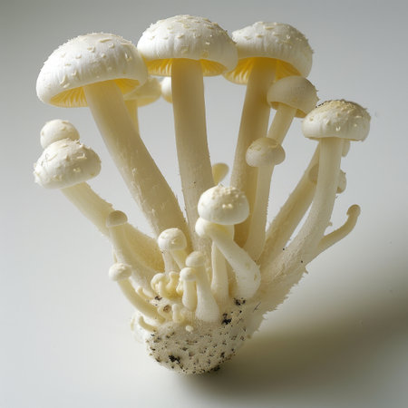 This image features fresh mushrooms with smooth caps and slender stems, perfect for culinary applications. Displayed against a minimal background, it highlights freshness.
