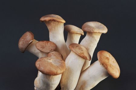 Closeup of growing king oyster mushrooms in front of black background, fungiculture, copyspace