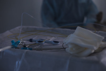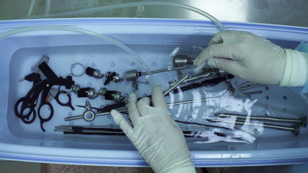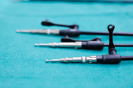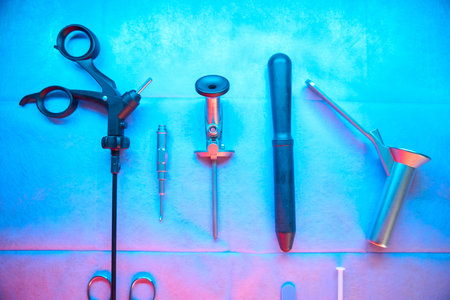 Close up steralized surgical tools for laparoscopic surgery. Selective focus
