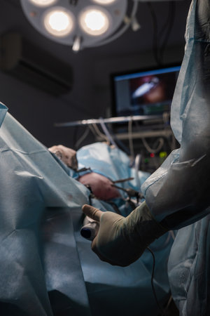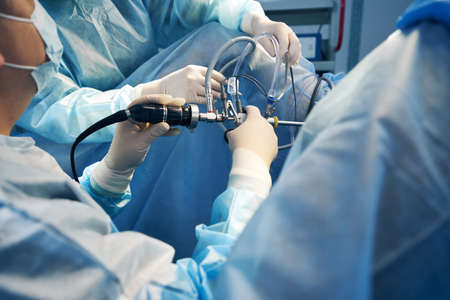 Arthroscope surgery. Orthopedic surgeons in teamwork in the operating room with modern arthroscopic tools. Knee surgery. Hospital background