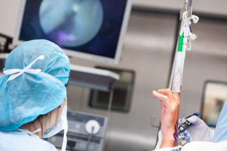 Surgeon woman doing surgical operation with laparoscopic instruments