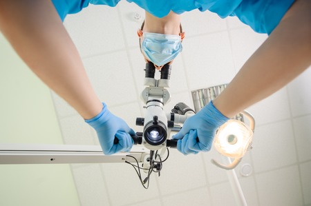 Dentist holding a microscope first-person view from below. Doctor with a microscope in a dental clinic. Oral procedure concept.