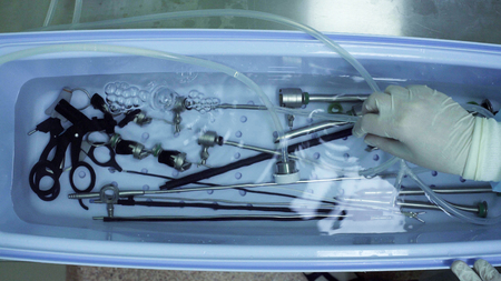 in a central sterilization department, the instruments used for an endoscopic operation are placed in a washing basket for endoscopic instruments