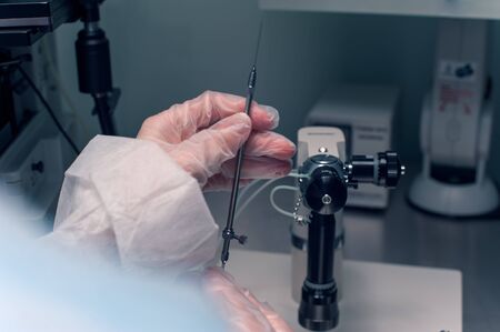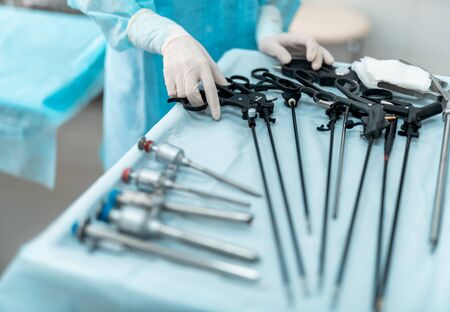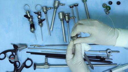The nurse prepares the instrument for laparoscopic surgery. Assistance for operations. Unrecognizable person. Medical instruments.Modern precision medicine.