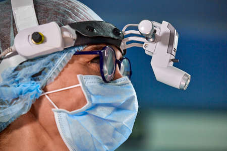 Close up portrait of female surgeon doctor wearing protective mask and hat during the operation. Healthcare, medical education, surgery concept.