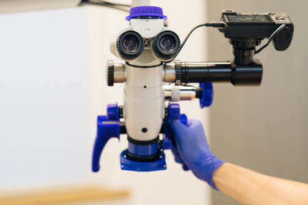 Modern dental clinic with microscope tool for treatment patients. Doctor hand in protective glove putting medical microscope. Man dentist uses microscope. Medical equipment, dental clinic