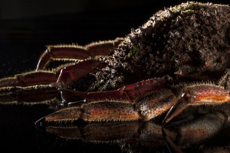 Ancestral aquatic tank in starting blocks Closeup of an orange European spider crab Maja Squinado in studio with macro lens on luxury black background