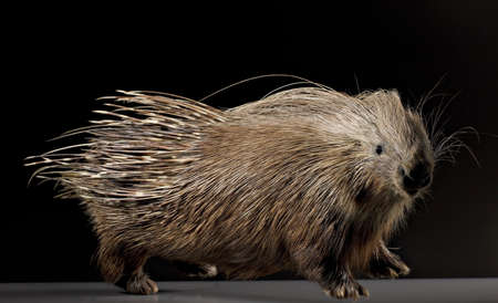 Stuffed specimen of Crested porcupine (Hystrix cristata) with black background