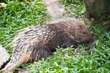 Portrait of a cute porcupine. Malay porcupine or Himalayan porcupine , Hystrix brachyura - a kind of dangerous night mammals rodents shooting poisonous empennage plumage