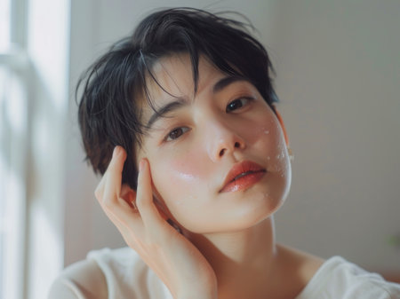 Young woman touching her face skin in the living room at home healthy and beautiful concept.